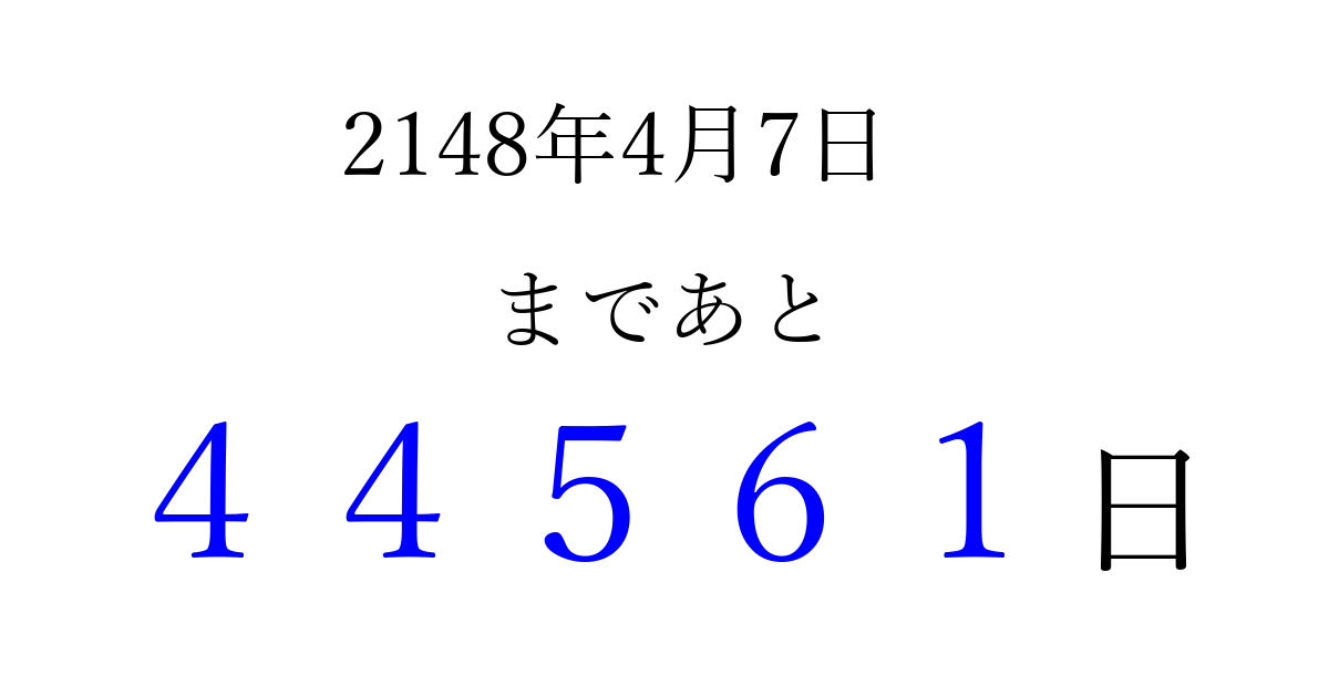 2148年4月7日(日)まで あと 99999 日です 追加すると、トップページからすぐ選べるようになります ※2026/04/06現在の結果です。 最新の状態に更新する ↓シェアして、タイムライン上にカウントダウンを表示しよう!↓ 📤 この結果を共有する Tweet シェア Threads Bluesky 別の日付でカウントダウン 2148年4月のカレンダー このページをブックマークに追加すると、いつでもカウントダウンを確認できます。 (PC: Ctrl+D / Mac: ⌘+D) hitome-notes.comでは以下のページも運営しています。 指定日と期間から日付を計算 | ガチャ確率計算・シミュレーション | プライバシー・ポリシー 運営者:Avocado