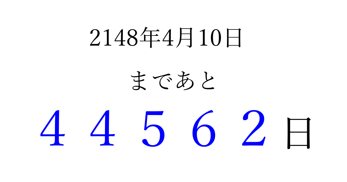 2148年4月10日(水)まで あと 99999 日です 追加すると、トップページからすぐ選べるようになります ※2026/04/08現在の結果です。 最新の状態に更新する ↓シェアして、タイムライン上にカウントダウンを表示しよう!↓ 📤 この結果を共有する Tweet シェア Threads Bluesky 別の日付でカウントダウン 2148年4月のカレンダー このページをブックマークに追加すると、いつでもカウントダウンを確認できます。 (PC: Ctrl+D / Mac: ⌘+D) hitome-notes.comでは以下のページも運営しています。 指定日と期間から日付を計算 | ガチャ確率計算・シミュレーション | プライバシー・ポリシー 運営者:Avocado