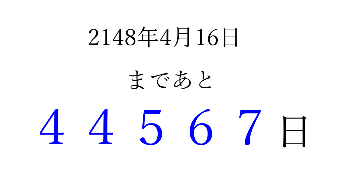 2148年4月16日(火)まで あと 99999 日です 追加すると、トップページからすぐ選べるようになります ※2026/04/09現在の結果です。 最新の状態に更新する ↓シェアして、タイムライン上にカウントダウンを表示しよう!↓ 📤 この結果を共有する Tweet シェア Threads Bluesky 別の日付でカウントダウン 2148年4月のカレンダー このページをブックマークに追加すると、いつでもカウントダウンを確認できます。 (PC: Ctrl+D / Mac: ⌘+D) hitome-notes.comでは以下のページも運営しています。 指定日と期間から日付を計算 | ガチャ確率計算・シミュレーション | プライバシー・ポリシー 運営者:Avocado