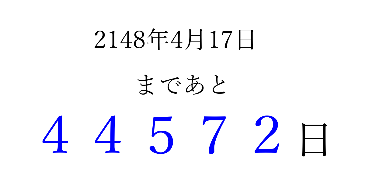2148年4月17日(水)まで あと 99999 日です 追加すると、トップページからすぐ選べるようになります ※2026/04/05現在の結果です。 最新の状態に更新する ↓シェアして、タイムライン上にカウントダウンを表示しよう!↓ 📤 この結果を共有する Tweet シェア Threads Bluesky 別の日付でカウントダウン 2148年4月のカレンダー このページをブックマークに追加すると、いつでもカウントダウンを確認できます。 (PC: Ctrl+D / Mac: ⌘+D) hitome-notes.comでは以下のページも運営しています。 指定日と期間から日付を計算 | ガチャ確率計算・シミュレーション | プライバシー・ポリシー 運営者:Avocado