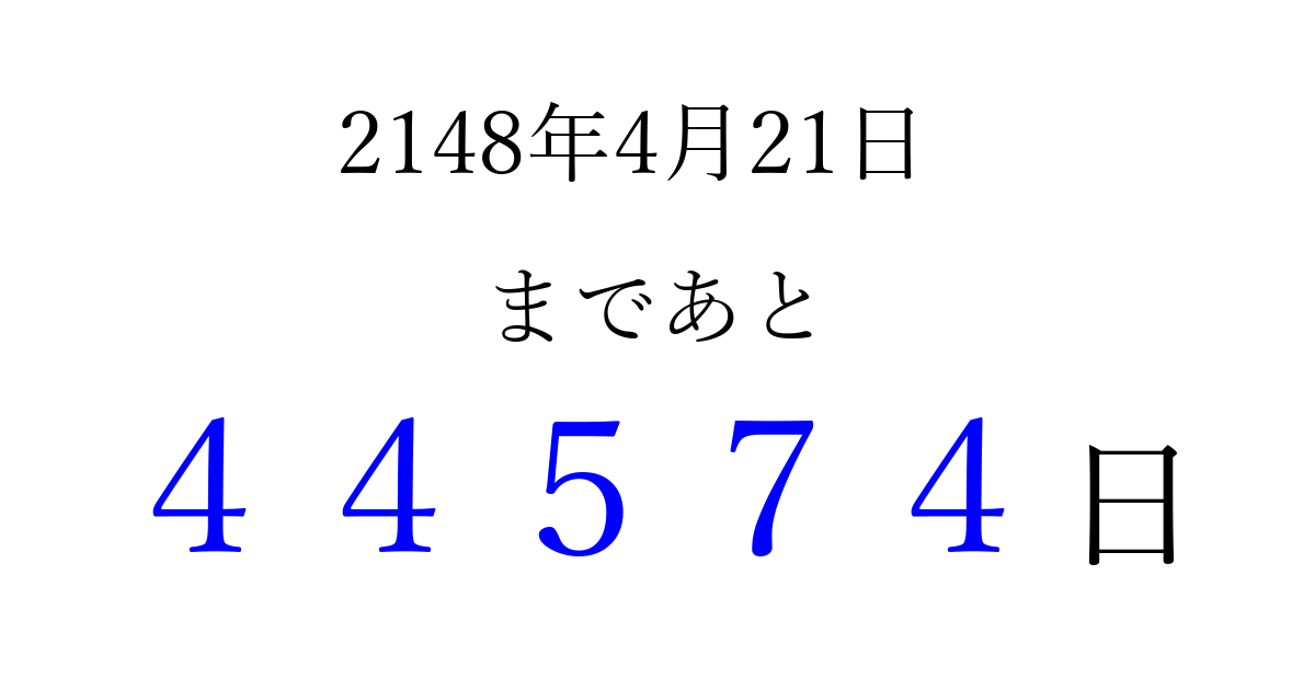 2148年4月21日(日)まで あと 99999 日です 追加すると、トップページからすぐ選べるようになります ※2026/04/07現在の結果です。 最新の状態に更新する ↓シェアして、タイムライン上にカウントダウンを表示しよう!↓ 📤 この結果を共有する Tweet シェア Threads Bluesky 別の日付でカウントダウン 2148年4月のカレンダー このページをブックマークに追加すると、いつでもカウントダウンを確認できます。 (PC: Ctrl+D / Mac: ⌘+D) hitome-notes.comでは以下のページも運営しています。 指定日と期間から日付を計算 | ガチャ確率計算・シミュレーション | プライバシー・ポリシー 運営者:Avocado