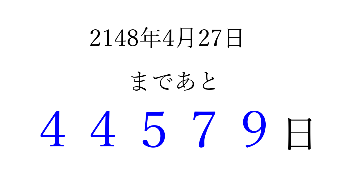 2148年4月27日(土)まで あと 99999 日です 追加すると、トップページからすぐ選べるようになります ※2026/04/08現在の結果です。 最新の状態に更新する ↓シェアして、タイムライン上にカウントダウンを表示しよう!↓ 📤 この結果を共有する Tweet シェア Threads Bluesky 別の日付でカウントダウン 2148年4月のカレンダー このページをブックマークに追加すると、いつでもカウントダウンを確認できます。 (PC: Ctrl+D / Mac: ⌘+D) hitome-notes.comでは以下のページも運営しています。 指定日と期間から日付を計算 | ガチャ確率計算・シミュレーション | プライバシー・ポリシー 運営者:Avocado