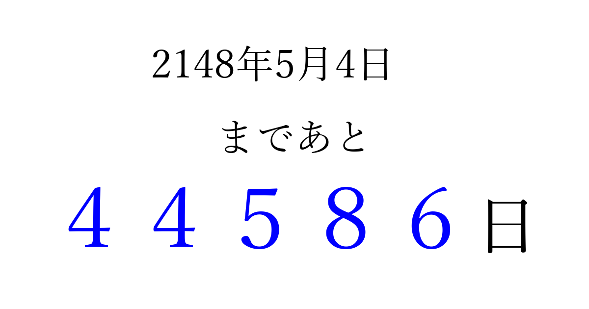 2148年5月4日(土)まで あと 99999 日です 追加すると、トップページからすぐ選べるようになります ※2026/04/08現在の結果です。 最新の状態に更新する ↓シェアして、タイムライン上にカウントダウンを表示しよう!↓ 📤 この結果を共有する Tweet シェア Threads Bluesky 別の日付でカウントダウン 2148年5月のカレンダー このページをブックマークに追加すると、いつでもカウントダウンを確認できます。 (PC: Ctrl+D / Mac: ⌘+D) hitome-notes.comでは以下のページも運営しています。 指定日と期間から日付を計算 | ガチャ確率計算・シミュレーション | プライバシー・ポリシー 運営者:Avocado