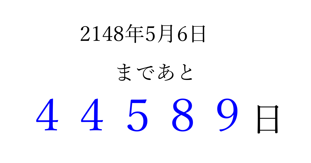 2148年5月6日(月)まで あと 99999 日です 追加すると、トップページからすぐ選べるようになります ※2026/04/07現在の結果です。 最新の状態に更新する ↓シェアして、タイムライン上にカウントダウンを表示しよう!↓ 📤 この結果を共有する Tweet シェア Threads Bluesky 別の日付でカウントダウン 2148年5月のカレンダー このページをブックマークに追加すると、いつでもカウントダウンを確認できます。 (PC: Ctrl+D / Mac: ⌘+D) hitome-notes.comでは以下のページも運営しています。 指定日と期間から日付を計算 | ガチャ確率計算・シミュレーション | プライバシー・ポリシー 運営者:Avocado