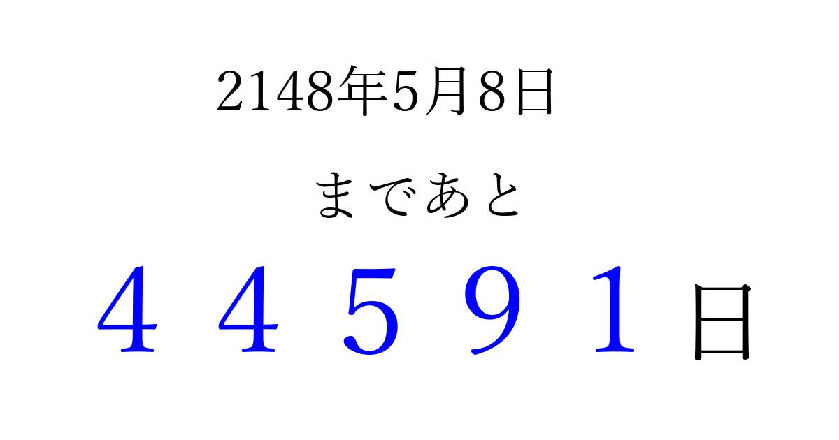 2148年5月8日(水)まで あと 99999 日です 追加すると、トップページからすぐ選べるようになります ※2026/04/07現在の結果です。 最新の状態に更新する ↓シェアして、タイムライン上にカウントダウンを表示しよう!↓ 📤 この結果を共有する Tweet シェア Threads Bluesky 別の日付でカウントダウン 2148年5月のカレンダー このページをブックマークに追加すると、いつでもカウントダウンを確認できます。 (PC: Ctrl+D / Mac: ⌘+D) hitome-notes.comでは以下のページも運営しています。 指定日と期間から日付を計算 | ガチャ確率計算・シミュレーション | プライバシー・ポリシー 運営者:Avocado
