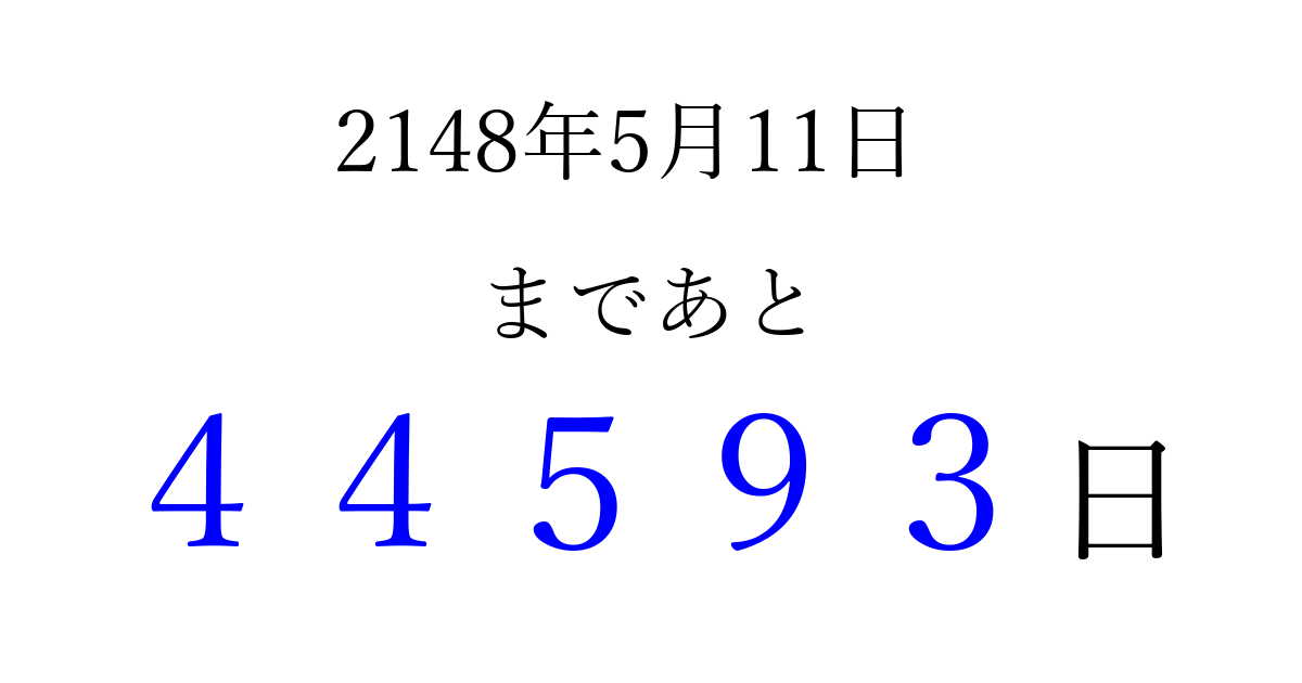 2148年5月11日(土)まで あと 99999 日です 追加すると、トップページからすぐ選べるようになります ※2026/04/08現在の結果です。 最新の状態に更新する ↓シェアして、タイムライン上にカウントダウンを表示しよう!↓ 📤 この結果を共有する Tweet シェア Threads Bluesky 別の日付でカウントダウン 2148年5月のカレンダー このページをブックマークに追加すると、いつでもカウントダウンを確認できます。 (PC: Ctrl+D / Mac: ⌘+D) hitome-notes.comでは以下のページも運営しています。 指定日と期間から日付を計算 | ガチャ確率計算・シミュレーション | プライバシー・ポリシー 運営者:Avocado
