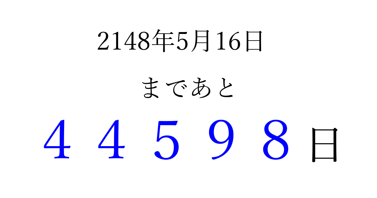 2148年5月16日(木)まで あと 99999 日です 追加すると、トップページからすぐ選べるようになります ※2026/04/08現在の結果です。 最新の状態に更新する ↓シェアして、タイムライン上にカウントダウンを表示しよう!↓ 📤 この結果を共有する Tweet シェア Threads Bluesky 別の日付でカウントダウン 2148年5月のカレンダー このページをブックマークに追加すると、いつでもカウントダウンを確認できます。 (PC: Ctrl+D / Mac: ⌘+D) hitome-notes.comでは以下のページも運営しています。 指定日と期間から日付を計算 | ガチャ確率計算・シミュレーション | プライバシー・ポリシー 運営者:Avocado