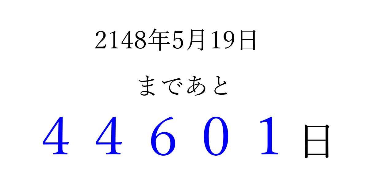 2148年5月19日(日)まで あと 99999 日です 追加すると、トップページからすぐ選べるようになります ※2026/04/08現在の結果です。 最新の状態に更新する ↓シェアして、タイムライン上にカウントダウンを表示しよう!↓ 📤 この結果を共有する Tweet シェア Threads Bluesky 別の日付でカウントダウン 2148年5月のカレンダー このページをブックマークに追加すると、いつでもカウントダウンを確認できます。 (PC: Ctrl+D / Mac: ⌘+D) hitome-notes.comでは以下のページも運営しています。 指定日と期間から日付を計算 | ガチャ確率計算・シミュレーション | プライバシー・ポリシー 運営者:Avocado