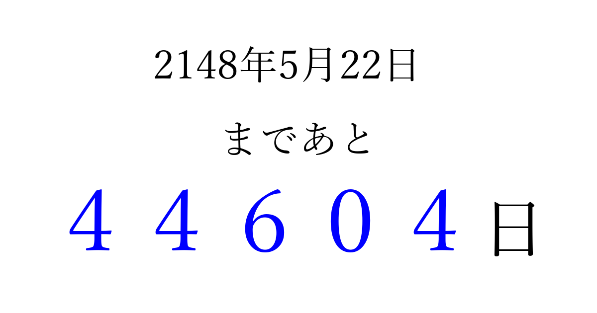 2148年5月22日(水)まで あと 99999 日です 追加すると、トップページからすぐ選べるようになります ※2026/04/08現在の結果です。 最新の状態に更新する ↓シェアして、タイムライン上にカウントダウンを表示しよう!↓ 📤 この結果を共有する Tweet シェア Threads Bluesky 別の日付でカウントダウン 2148年5月のカレンダー このページをブックマークに追加すると、いつでもカウントダウンを確認できます。 (PC: Ctrl+D / Mac: ⌘+D) hitome-notes.comでは以下のページも運営しています。 指定日と期間から日付を計算 | ガチャ確率計算・シミュレーション | プライバシー・ポリシー 運営者:Avocado