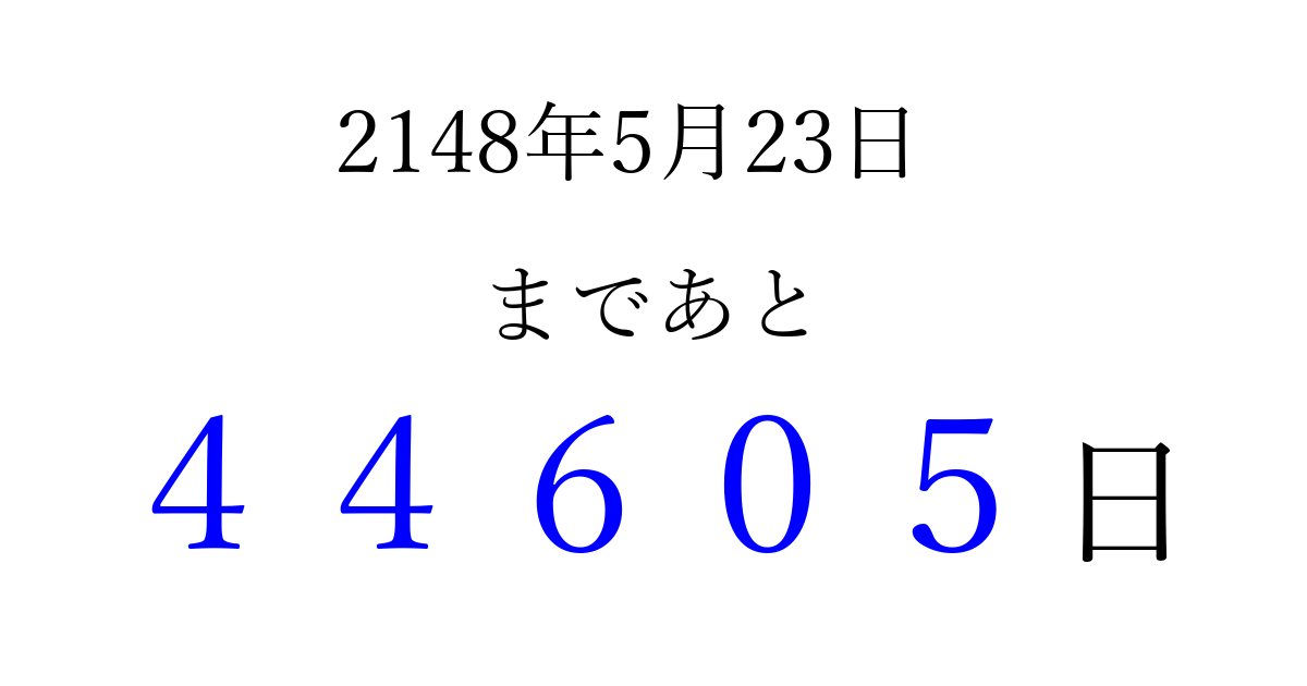 2148年5月23日(木)まで あと 99999 日です 追加すると、トップページからすぐ選べるようになります ※2026/04/08現在の結果です。 最新の状態に更新する ↓シェアして、タイムライン上にカウントダウンを表示しよう!↓ 📤 この結果を共有する Tweet シェア Threads Bluesky 別の日付でカウントダウン 2148年5月のカレンダー このページをブックマークに追加すると、いつでもカウントダウンを確認できます。 (PC: Ctrl+D / Mac: ⌘+D) hitome-notes.comでは以下のページも運営しています。 指定日と期間から日付を計算 | ガチャ確率計算・シミュレーション | プライバシー・ポリシー 運営者:Avocado