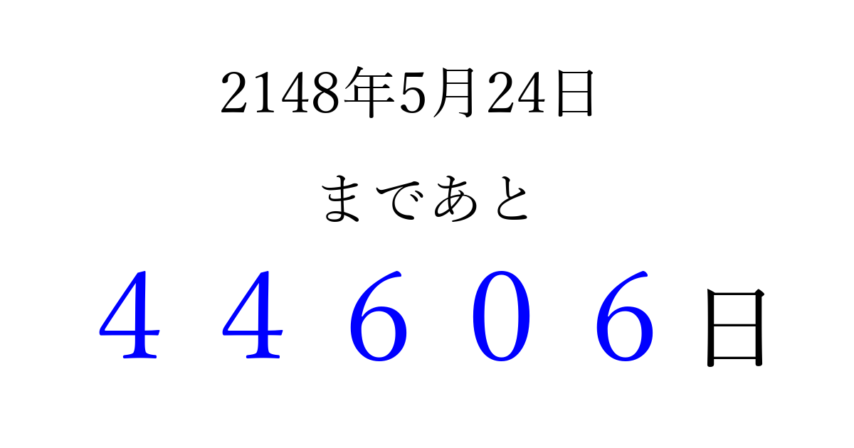 2148年5月24日(金)まで あと 99999 日です 追加すると、トップページからすぐ選べるようになります ※2026/04/08現在の結果です。 最新の状態に更新する ↓シェアして、タイムライン上にカウントダウンを表示しよう!↓ 📤 この結果を共有する Tweet シェア Threads Bluesky 別の日付でカウントダウン 2148年5月のカレンダー このページをブックマークに追加すると、いつでもカウントダウンを確認できます。 (PC: Ctrl+D / Mac: ⌘+D) hitome-notes.comでは以下のページも運営しています。 指定日と期間から日付を計算 | ガチャ確率計算・シミュレーション | プライバシー・ポリシー 運営者:Avocado