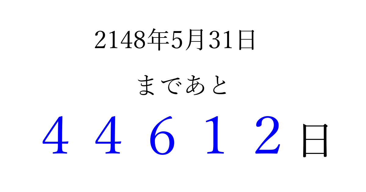 2148年5月31日(金)まで あと 99999 日です 追加すると、トップページからすぐ選べるようになります ※2026/04/09現在の結果です。 最新の状態に更新する ↓シェアして、タイムライン上にカウントダウンを表示しよう!↓ 📤 この結果を共有する Tweet シェア Threads Bluesky 別の日付でカウントダウン 2148年5月のカレンダー このページをブックマークに追加すると、いつでもカウントダウンを確認できます。 (PC: Ctrl+D / Mac: ⌘+D) hitome-notes.comでは以下のページも運営しています。 指定日と期間から日付を計算 | ガチャ確率計算・シミュレーション | プライバシー・ポリシー 運営者:Avocado
