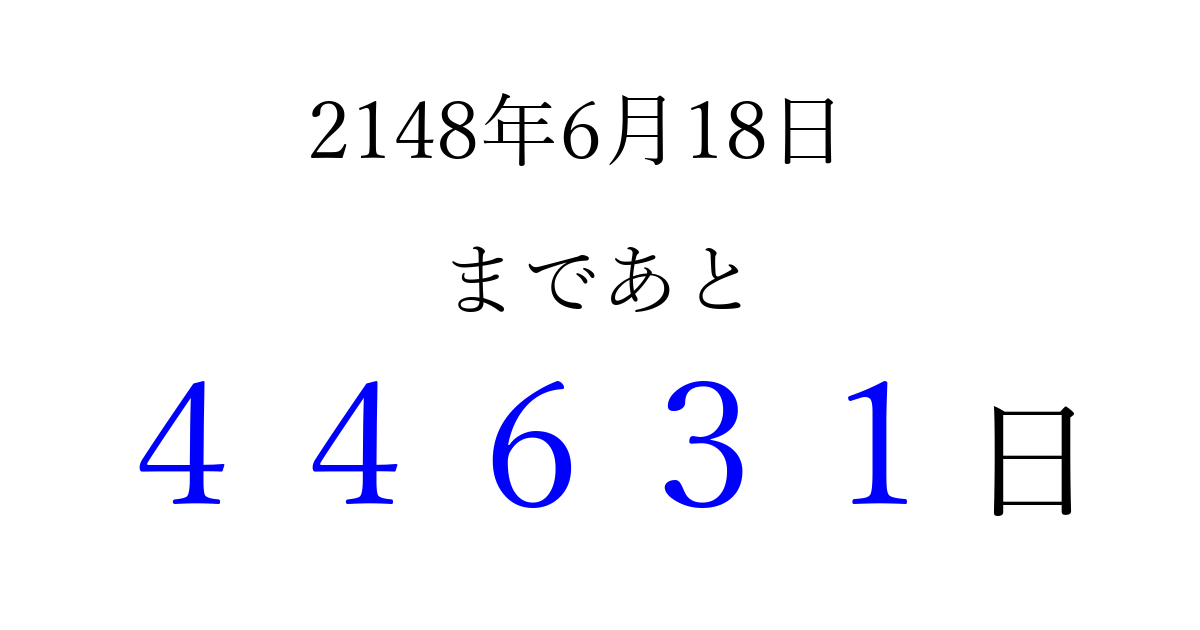 2148年6月18日(火)まで あと 99999 日です 追加すると、トップページからすぐ選べるようになります ※2026/04/08現在の結果です。 最新の状態に更新する ↓シェアして、タイムライン上にカウントダウンを表示しよう!↓ 📤 この結果を共有する Tweet シェア Threads Bluesky 別の日付でカウントダウン 2148年6月のカレンダー このページをブックマークに追加すると、いつでもカウントダウンを確認できます。 (PC: Ctrl+D / Mac: ⌘+D) hitome-notes.comでは以下のページも運営しています。 指定日と期間から日付を計算 | ガチャ確率計算・シミュレーション | プライバシー・ポリシー 運営者:Avocado