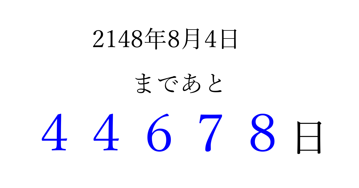 2148年8月4日(日)まで あと 99999 日です 追加すると、トップページからすぐ選べるようになります ※2026/04/08現在の結果です。 最新の状態に更新する ↓シェアして、タイムライン上にカウントダウンを表示しよう!↓ 📤 この結果を共有する Tweet シェア Threads Bluesky 別の日付でカウントダウン 2148年8月のカレンダー このページをブックマークに追加すると、いつでもカウントダウンを確認できます。 (PC: Ctrl+D / Mac: ⌘+D) hitome-notes.comでは以下のページも運営しています。 指定日と期間から日付を計算 | ガチャ確率計算・シミュレーション | プライバシー・ポリシー 運営者:Avocado