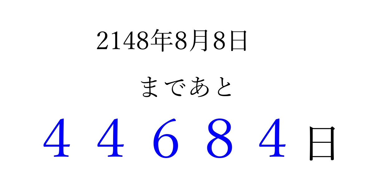 2148年8月8日(木)まで あと 99999 日です 追加すると、トップページからすぐ選べるようになります ※2026/04/06現在の結果です。 最新の状態に更新する ↓シェアして、タイムライン上にカウントダウンを表示しよう!↓ 📤 この結果を共有する Tweet シェア Threads Bluesky 別の日付でカウントダウン 2148年8月のカレンダー このページをブックマークに追加すると、いつでもカウントダウンを確認できます。 (PC: Ctrl+D / Mac: ⌘+D) hitome-notes.comでは以下のページも運営しています。 指定日と期間から日付を計算 | ガチャ確率計算・シミュレーション | プライバシー・ポリシー 運営者:Avocado