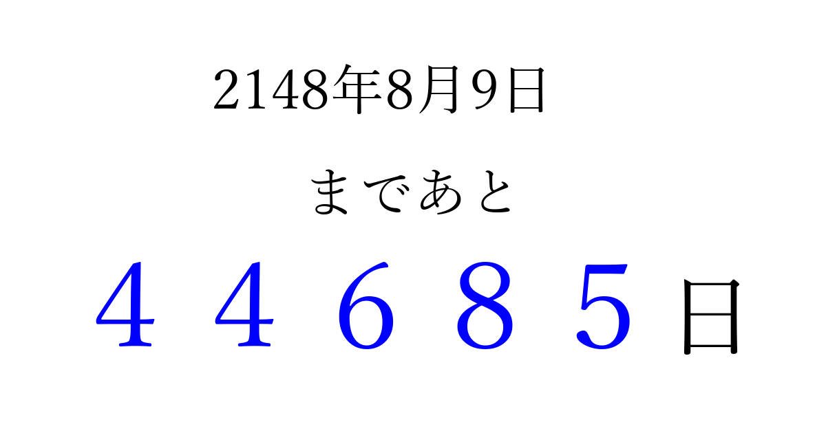 2148年8月9日(金)まで あと 99999 日です 追加すると、トップページからすぐ選べるようになります ※2026/04/06現在の結果です。 最新の状態に更新する ↓シェアして、タイムライン上にカウントダウンを表示しよう!↓ 📤 この結果を共有する Tweet シェア Threads Bluesky 別の日付でカウントダウン 2148年8月のカレンダー このページをブックマークに追加すると、いつでもカウントダウンを確認できます。 (PC: Ctrl+D / Mac: ⌘+D) hitome-notes.comでは以下のページも運営しています。 指定日と期間から日付を計算 | ガチャ確率計算・シミュレーション | プライバシー・ポリシー 運営者:Avocado