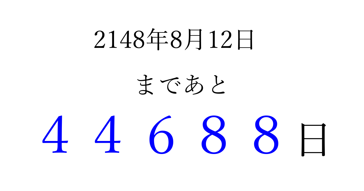 2148年8月12日(月)まで あと 99999 日です 追加すると、トップページからすぐ選べるようになります ※2026/04/06現在の結果です。 最新の状態に更新する ↓シェアして、タイムライン上にカウントダウンを表示しよう!↓ 📤 この結果を共有する Tweet シェア Threads Bluesky 別の日付でカウントダウン 2148年8月のカレンダー このページをブックマークに追加すると、いつでもカウントダウンを確認できます。 (PC: Ctrl+D / Mac: ⌘+D) hitome-notes.comでは以下のページも運営しています。 指定日と期間から日付を計算 | ガチャ確率計算・シミュレーション | プライバシー・ポリシー 運営者:Avocado