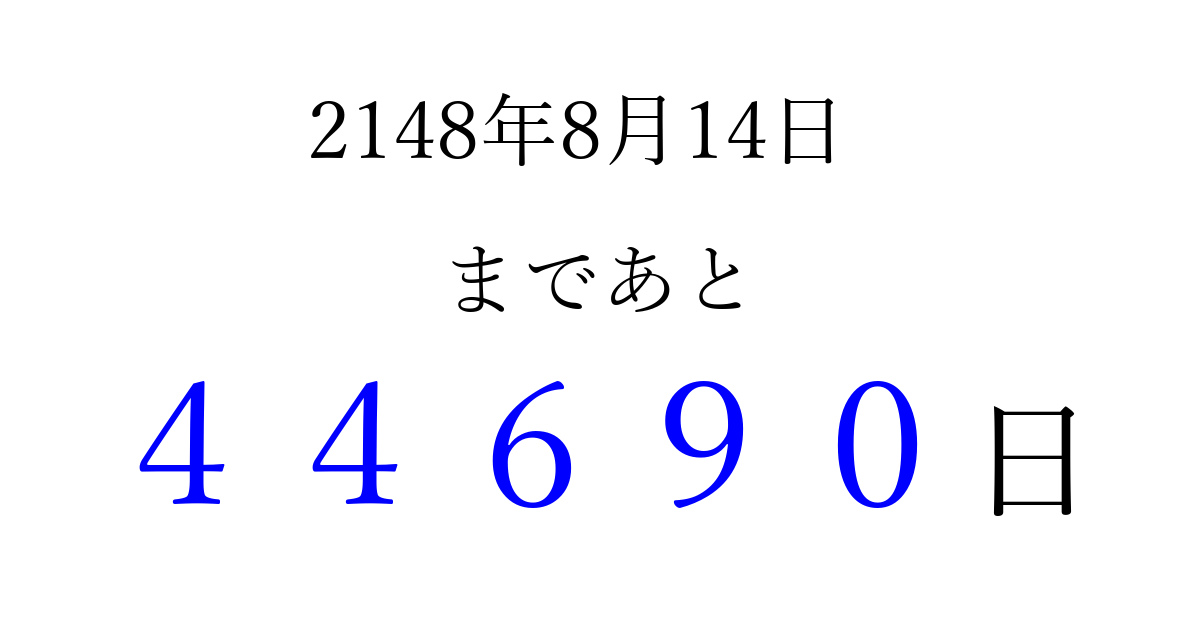 2148年8月14日(水)まで あと 99999 日です 追加すると、トップページからすぐ選べるようになります ※2026/04/06現在の結果です。 最新の状態に更新する ↓シェアして、タイムライン上にカウントダウンを表示しよう!↓ 📤 この結果を共有する Tweet シェア Threads Bluesky 別の日付でカウントダウン 2148年8月のカレンダー このページをブックマークに追加すると、いつでもカウントダウンを確認できます。 (PC: Ctrl+D / Mac: ⌘+D) hitome-notes.comでは以下のページも運営しています。 指定日と期間から日付を計算 | ガチャ確率計算・シミュレーション | プライバシー・ポリシー 運営者:Avocado