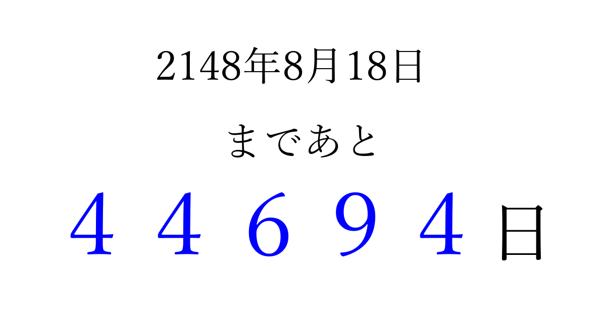 2148年8月18日(日)まで あと 99999 日です 追加すると、トップページからすぐ選べるようになります ※2026/04/06現在の結果です。 最新の状態に更新する ↓シェアして、タイムライン上にカウントダウンを表示しよう!↓ 📤 この結果を共有する Tweet シェア Threads Bluesky 別の日付でカウントダウン 2148年8月のカレンダー このページをブックマークに追加すると、いつでもカウントダウンを確認できます。 (PC: Ctrl+D / Mac: ⌘+D) hitome-notes.comでは以下のページも運営しています。 指定日と期間から日付を計算 | ガチャ確率計算・シミュレーション | プライバシー・ポリシー 運営者:Avocado