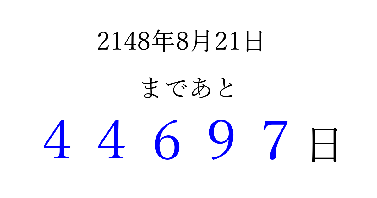 2148年8月21日(水)まで あと 99999 日です 追加すると、トップページからすぐ選べるようになります ※2026/04/06現在の結果です。 最新の状態に更新する ↓シェアして、タイムライン上にカウントダウンを表示しよう!↓ 📤 この結果を共有する Tweet シェア Threads Bluesky 別の日付でカウントダウン 2148年8月のカレンダー このページをブックマークに追加すると、いつでもカウントダウンを確認できます。 (PC: Ctrl+D / Mac: ⌘+D) hitome-notes.comでは以下のページも運営しています。 指定日と期間から日付を計算 | ガチャ確率計算・シミュレーション | プライバシー・ポリシー 運営者:Avocado