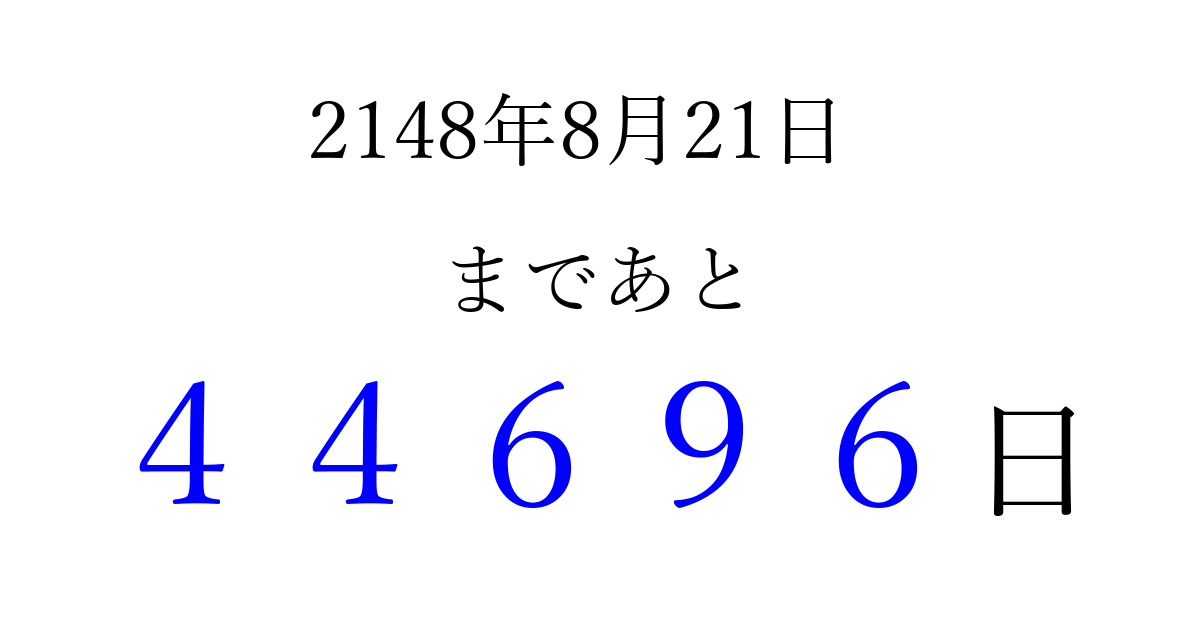 2148年8月21日(水)まで あと 99999 日です 追加すると、トップページからすぐ選べるようになります ※2026/04/07現在の結果です。 最新の状態に更新する ↓シェアして、タイムライン上にカウントダウンを表示しよう!↓ 📤 この結果を共有する Tweet シェア Threads Bluesky 別の日付でカウントダウン 2148年8月のカレンダー このページをブックマークに追加すると、いつでもカウントダウンを確認できます。 (PC: Ctrl+D / Mac: ⌘+D) hitome-notes.comでは以下のページも運営しています。 指定日と期間から日付を計算 | ガチャ確率計算・シミュレーション | プライバシー・ポリシー 運営者:Avocado