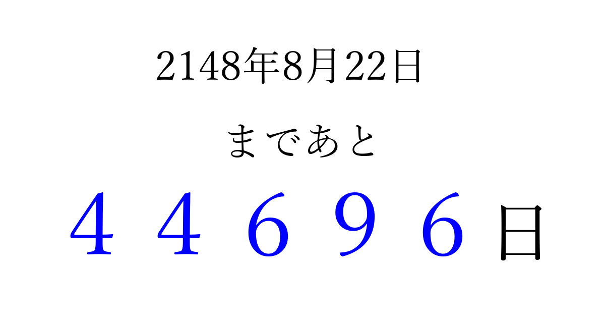 2148年8月22日(木)まで あと 99999 日です 追加すると、トップページからすぐ選べるようになります ※2026/04/08現在の結果です。 最新の状態に更新する ↓シェアして、タイムライン上にカウントダウンを表示しよう!↓ 📤 この結果を共有する Tweet シェア Threads Bluesky 別の日付でカウントダウン 2148年8月のカレンダー このページをブックマークに追加すると、いつでもカウントダウンを確認できます。 (PC: Ctrl+D / Mac: ⌘+D) hitome-notes.comでは以下のページも運営しています。 指定日と期間から日付を計算 | ガチャ確率計算・シミュレーション | プライバシー・ポリシー 運営者:Avocado