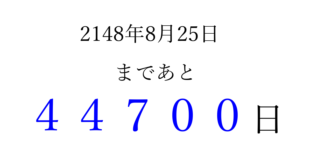 2148年8月25日(日)まで あと 99999 日です 追加すると、トップページからすぐ選べるようになります ※2026/04/07現在の結果です。 最新の状態に更新する ↓シェアして、タイムライン上にカウントダウンを表示しよう!↓ 📤 この結果を共有する Tweet シェア Threads Bluesky 別の日付でカウントダウン 2148年8月のカレンダー このページをブックマークに追加すると、いつでもカウントダウンを確認できます。 (PC: Ctrl+D / Mac: ⌘+D) hitome-notes.comでは以下のページも運営しています。 指定日と期間から日付を計算 | ガチャ確率計算・シミュレーション | プライバシー・ポリシー 運営者:Avocado