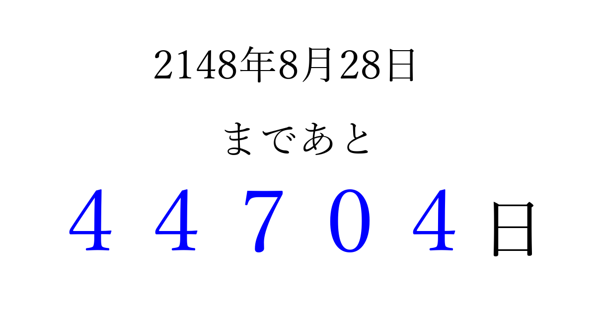 2148年8月28日(水)まで あと 99999 日です 追加すると、トップページからすぐ選べるようになります ※2026/04/06現在の結果です。 最新の状態に更新する ↓シェアして、タイムライン上にカウントダウンを表示しよう!↓ 📤 この結果を共有する Tweet シェア Threads Bluesky 別の日付でカウントダウン 2148年8月のカレンダー このページをブックマークに追加すると、いつでもカウントダウンを確認できます。 (PC: Ctrl+D / Mac: ⌘+D) hitome-notes.comでは以下のページも運営しています。 指定日と期間から日付を計算 | ガチャ確率計算・シミュレーション | プライバシー・ポリシー 運営者:Avocado