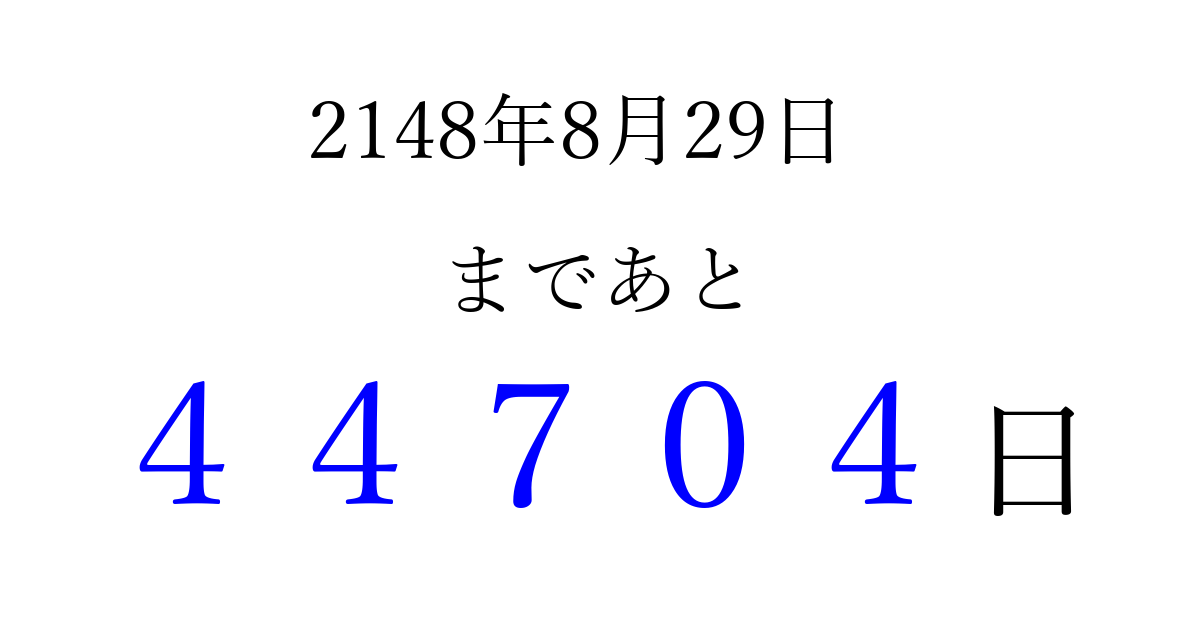 2148年8月29日(木)まで あと 99999 日です 追加すると、トップページからすぐ選べるようになります ※2026/04/07現在の結果です。 最新の状態に更新する ↓シェアして、タイムライン上にカウントダウンを表示しよう!↓ 📤 この結果を共有する Tweet シェア Threads Bluesky 別の日付でカウントダウン 2148年8月のカレンダー このページをブックマークに追加すると、いつでもカウントダウンを確認できます。 (PC: Ctrl+D / Mac: ⌘+D) hitome-notes.comでは以下のページも運営しています。 指定日と期間から日付を計算 | ガチャ確率計算・シミュレーション | プライバシー・ポリシー 運営者:Avocado