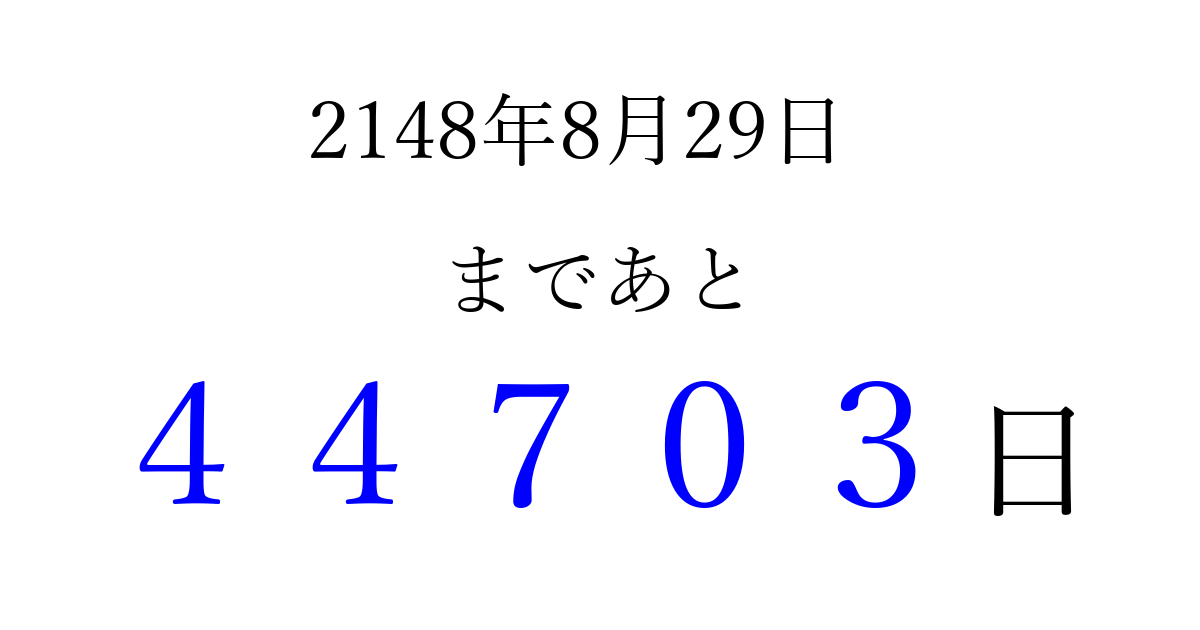 2148年8月29日(木)まで あと 99999 日です 追加すると、トップページからすぐ選べるようになります ※2026/04/08現在の結果です。 最新の状態に更新する ↓シェアして、タイムライン上にカウントダウンを表示しよう!↓ 📤 この結果を共有する Tweet シェア Threads Bluesky 別の日付でカウントダウン 2148年8月のカレンダー このページをブックマークに追加すると、いつでもカウントダウンを確認できます。 (PC: Ctrl+D / Mac: ⌘+D) hitome-notes.comでは以下のページも運営しています。 指定日と期間から日付を計算 | ガチャ確率計算・シミュレーション | プライバシー・ポリシー 運営者:Avocado