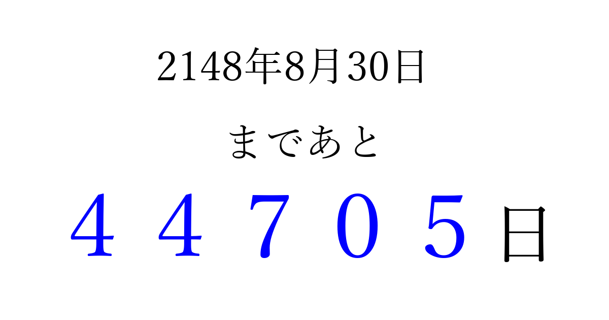 2148年8月30日(金)まで あと 99999 日です 追加すると、トップページからすぐ選べるようになります ※2026/04/07現在の結果です。 最新の状態に更新する ↓シェアして、タイムライン上にカウントダウンを表示しよう!↓ 📤 この結果を共有する Tweet シェア Threads Bluesky 別の日付でカウントダウン 2148年8月のカレンダー このページをブックマークに追加すると、いつでもカウントダウンを確認できます。 (PC: Ctrl+D / Mac: ⌘+D) hitome-notes.comでは以下のページも運営しています。 指定日と期間から日付を計算 | ガチャ確率計算・シミュレーション | プライバシー・ポリシー 運営者:Avocado