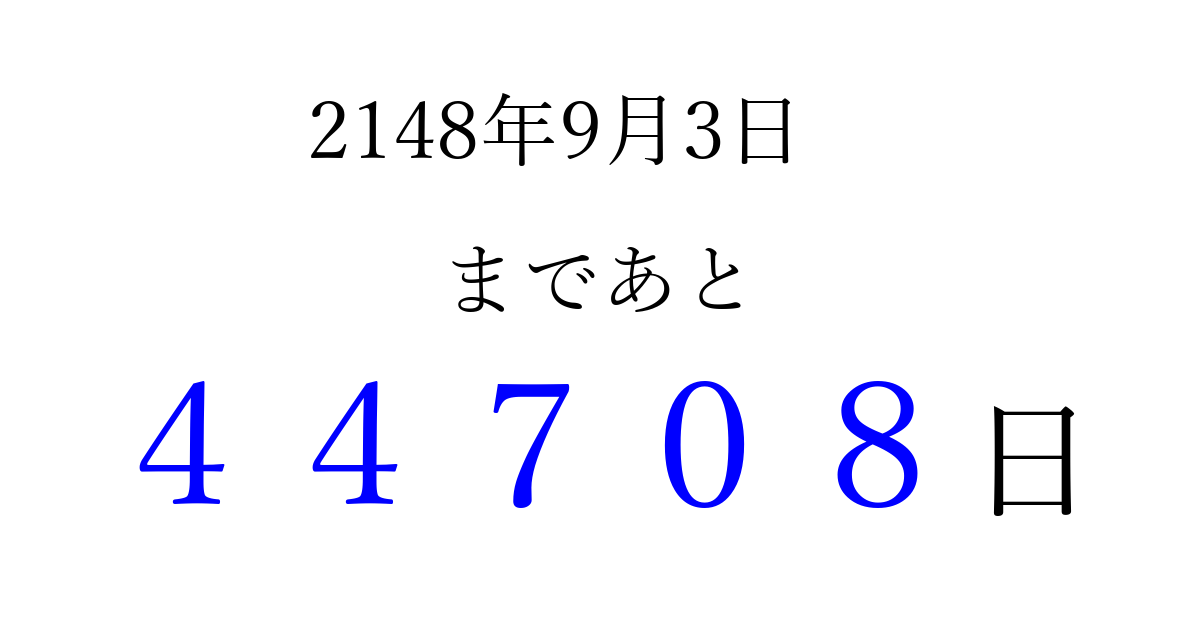 2148年9月3日(火)まで あと 99999 日です 追加すると、トップページからすぐ選べるようになります ※2026/04/08現在の結果です。 最新の状態に更新する ↓シェアして、タイムライン上にカウントダウンを表示しよう!↓ 📤 この結果を共有する Tweet シェア Threads Bluesky 別の日付でカウントダウン 2148年9月のカレンダー このページをブックマークに追加すると、いつでもカウントダウンを確認できます。 (PC: Ctrl+D / Mac: ⌘+D) hitome-notes.comでは以下のページも運営しています。 指定日と期間から日付を計算 | ガチャ確率計算・シミュレーション | プライバシー・ポリシー 運営者:Avocado