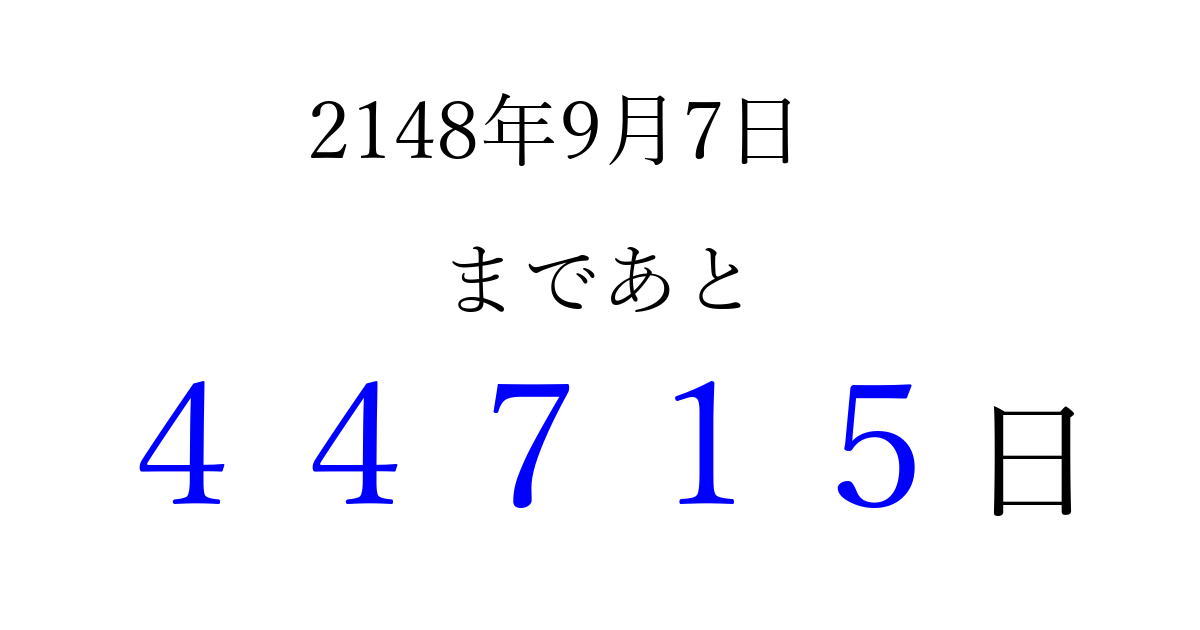 2148年9月7日(土)まで あと 99999 日です 追加すると、トップページからすぐ選べるようになります ※2026/04/05現在の結果です。 最新の状態に更新する ↓シェアして、タイムライン上にカウントダウンを表示しよう!↓ 📤 この結果を共有する Tweet シェア Threads Bluesky 別の日付でカウントダウン 2148年9月のカレンダー このページをブックマークに追加すると、いつでもカウントダウンを確認できます。 (PC: Ctrl+D / Mac: ⌘+D) hitome-notes.comでは以下のページも運営しています。 指定日と期間から日付を計算 | ガチャ確率計算・シミュレーション | プライバシー・ポリシー 運営者:Avocado