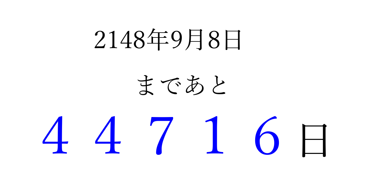 2148年9月8日(日)まで あと 99999 日です 追加すると、トップページからすぐ選べるようになります ※2026/04/05現在の結果です。 最新の状態に更新する ↓シェアして、タイムライン上にカウントダウンを表示しよう!↓ 📤 この結果を共有する Tweet シェア Threads Bluesky 別の日付でカウントダウン 2148年9月のカレンダー このページをブックマークに追加すると、いつでもカウントダウンを確認できます。 (PC: Ctrl+D / Mac: ⌘+D) hitome-notes.comでは以下のページも運営しています。 指定日と期間から日付を計算 | ガチャ確率計算・シミュレーション | プライバシー・ポリシー 運営者:Avocado