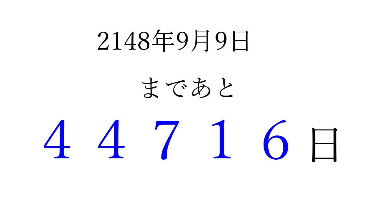 2148年9月9日(月)まで あと 99999 日です 追加すると、トップページからすぐ選べるようになります ※2026/04/06現在の結果です。 最新の状態に更新する ↓シェアして、タイムライン上にカウントダウンを表示しよう!↓ 📤 この結果を共有する Tweet シェア Threads Bluesky 別の日付でカウントダウン 2148年9月のカレンダー このページをブックマークに追加すると、いつでもカウントダウンを確認できます。 (PC: Ctrl+D / Mac: ⌘+D) hitome-notes.comでは以下のページも運営しています。 指定日と期間から日付を計算 | ガチャ確率計算・シミュレーション | プライバシー・ポリシー 運営者:Avocado