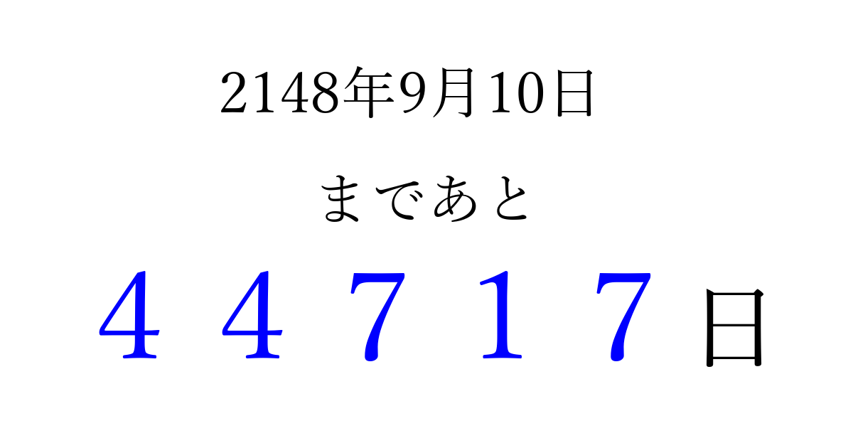 2148年9月10日(火)まで あと 99999 日です 追加すると、トップページからすぐ選べるようになります ※2026/04/06現在の結果です。 最新の状態に更新する ↓シェアして、タイムライン上にカウントダウンを表示しよう!↓ 📤 この結果を共有する Tweet シェア Threads Bluesky 別の日付でカウントダウン 2148年9月のカレンダー このページをブックマークに追加すると、いつでもカウントダウンを確認できます。 (PC: Ctrl+D / Mac: ⌘+D) hitome-notes.comでは以下のページも運営しています。 指定日と期間から日付を計算 | ガチャ確率計算・シミュレーション | プライバシー・ポリシー 運営者:Avocado