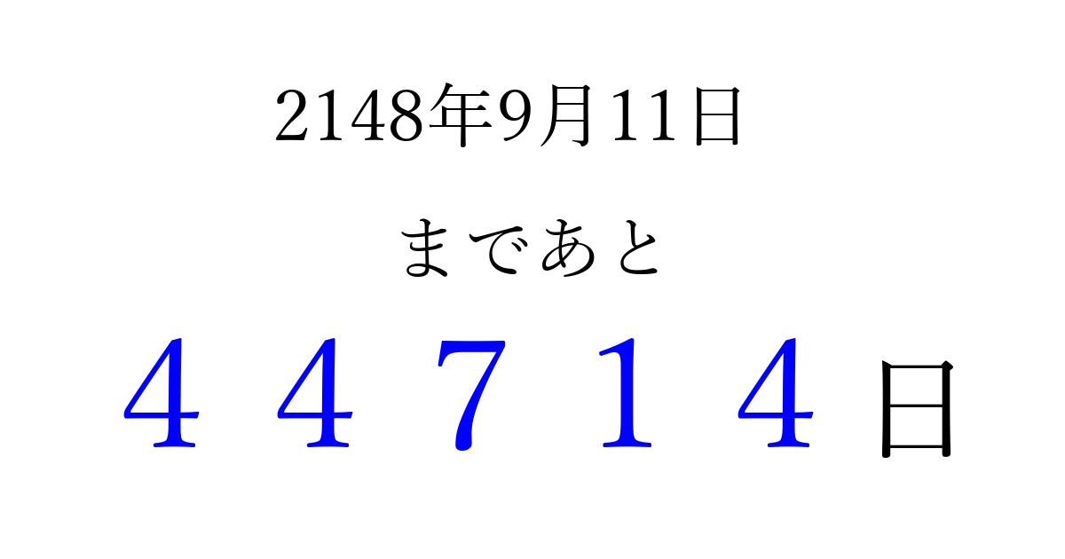 2148年9月11日(水)まで あと 99999 日です 追加すると、トップページからすぐ選べるようになります ※2026/04/10現在の結果です。 最新の状態に更新する ↓シェアして、タイムライン上にカウントダウンを表示しよう!↓ 📤 この結果を共有する Tweet シェア Threads Bluesky 別の日付でカウントダウン 2148年9月のカレンダー このページをブックマークに追加すると、いつでもカウントダウンを確認できます。 (PC: Ctrl+D / Mac: ⌘+D) hitome-notes.comでは以下のページも運営しています。 指定日と期間から日付を計算 | ガチャ確率計算・シミュレーション | プライバシー・ポリシー 運営者:Avocado