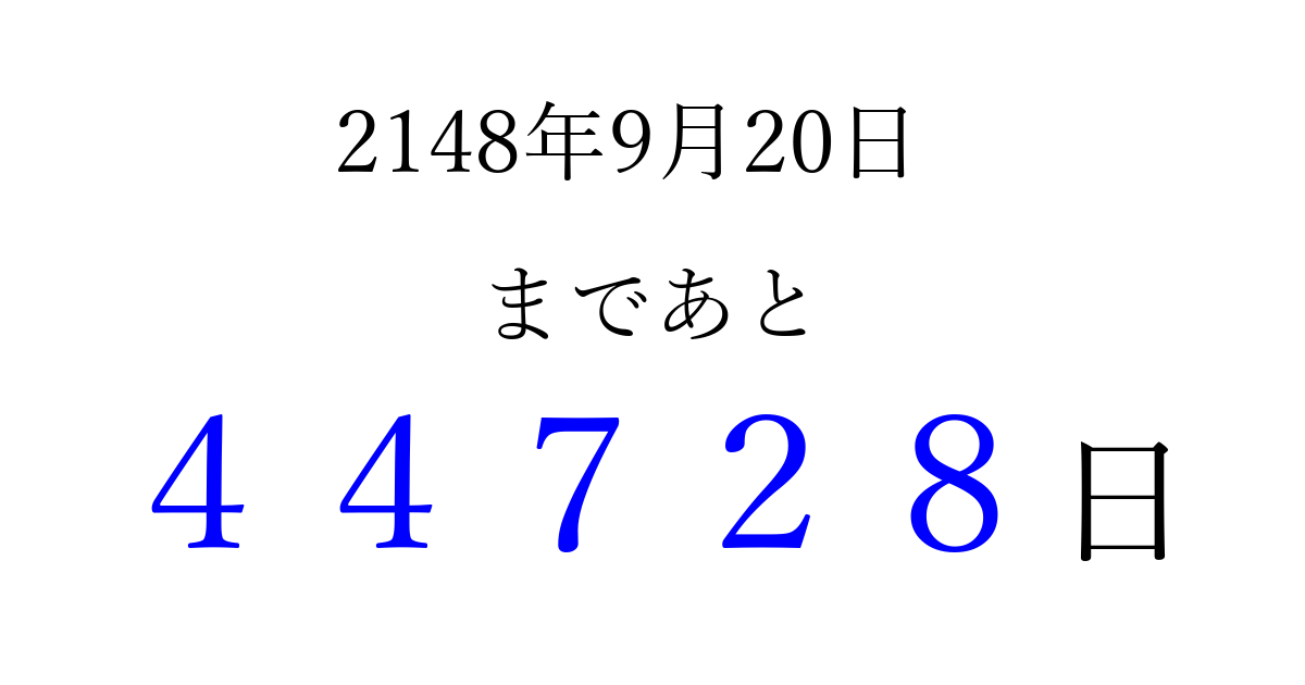 2148年9月20日(金)まで あと 99999 日です 追加すると、トップページからすぐ選べるようになります ※2026/04/05現在の結果です。 最新の状態に更新する ↓シェアして、タイムライン上にカウントダウンを表示しよう!↓ 📤 この結果を共有する Tweet シェア Threads Bluesky 別の日付でカウントダウン 2148年9月のカレンダー このページをブックマークに追加すると、いつでもカウントダウンを確認できます。 (PC: Ctrl+D / Mac: ⌘+D) hitome-notes.comでは以下のページも運営しています。 指定日と期間から日付を計算 | ガチャ確率計算・シミュレーション | プライバシー・ポリシー 運営者:Avocado