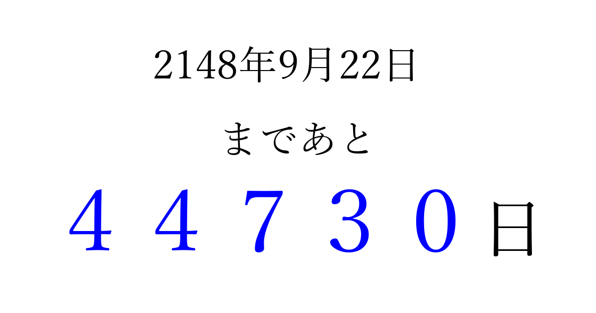 2148年9月22日(日)まで あと 99999 日です 追加すると、トップページからすぐ選べるようになります ※2026/04/05現在の結果です。 最新の状態に更新する ↓シェアして、タイムライン上にカウントダウンを表示しよう!↓ 📤 この結果を共有する Tweet シェア Threads Bluesky 別の日付でカウントダウン 2148年9月のカレンダー このページをブックマークに追加すると、いつでもカウントダウンを確認できます。 (PC: Ctrl+D / Mac: ⌘+D) hitome-notes.comでは以下のページも運営しています。 指定日と期間から日付を計算 | ガチャ確率計算・シミュレーション | プライバシー・ポリシー 運営者:Avocado