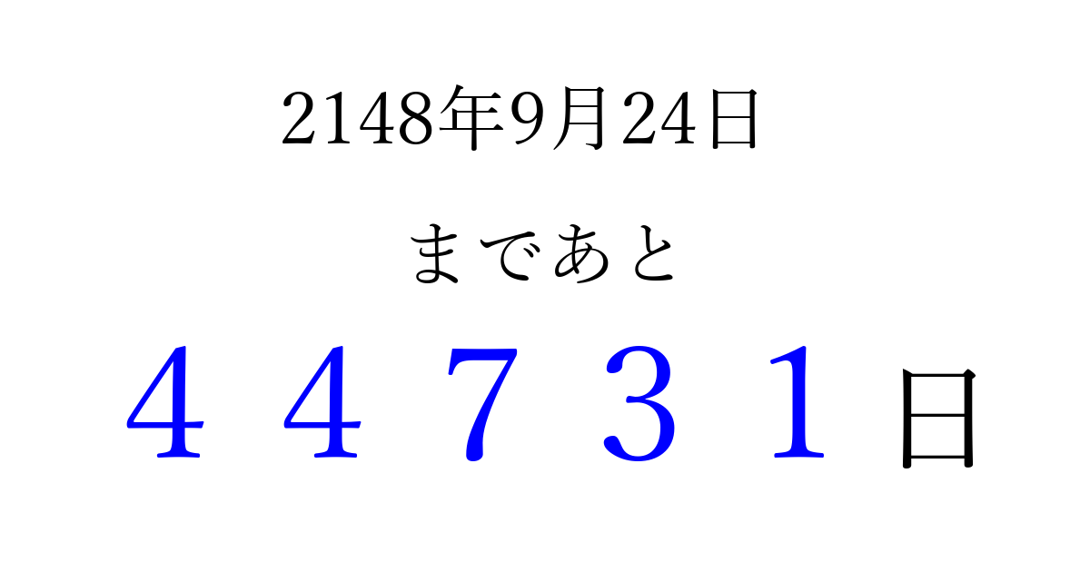 2148年9月24日(火)まで あと 99999 日です 追加すると、トップページからすぐ選べるようになります ※2026/04/06現在の結果です。 最新の状態に更新する ↓シェアして、タイムライン上にカウントダウンを表示しよう!↓ 📤 この結果を共有する Tweet シェア Threads Bluesky 別の日付でカウントダウン 2148年9月のカレンダー このページをブックマークに追加すると、いつでもカウントダウンを確認できます。 (PC: Ctrl+D / Mac: ⌘+D) hitome-notes.comでは以下のページも運営しています。 指定日と期間から日付を計算 | ガチャ確率計算・シミュレーション | プライバシー・ポリシー 運営者:Avocado