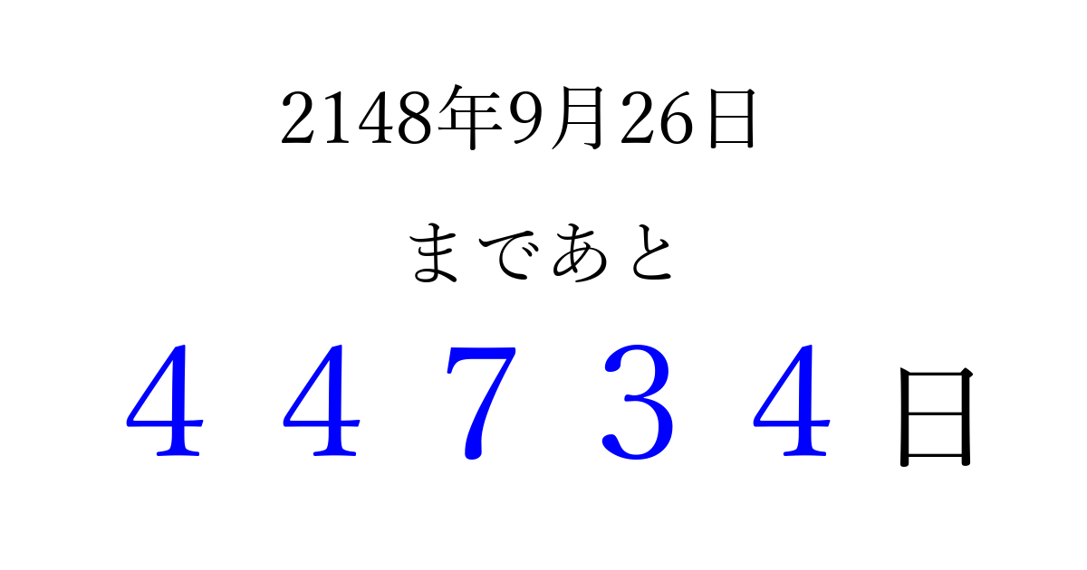 2148年9月26日(木)まで あと 99999 日です 追加すると、トップページからすぐ選べるようになります ※2026/04/05現在の結果です。 最新の状態に更新する ↓シェアして、タイムライン上にカウントダウンを表示しよう!↓ 📤 この結果を共有する Tweet シェア Threads Bluesky 別の日付でカウントダウン 2148年9月のカレンダー このページをブックマークに追加すると、いつでもカウントダウンを確認できます。 (PC: Ctrl+D / Mac: ⌘+D) hitome-notes.comでは以下のページも運営しています。 指定日と期間から日付を計算 | ガチャ確率計算・シミュレーション | プライバシー・ポリシー 運営者:Avocado