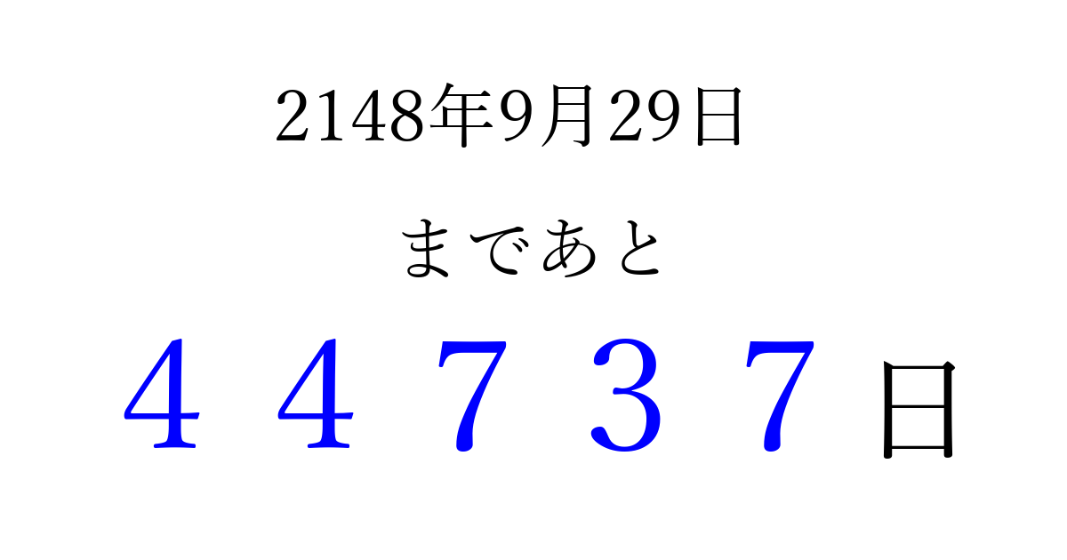 2148年9月29日(日)まで あと 99999 日です 追加すると、トップページからすぐ選べるようになります ※2026/04/05現在の結果です。 最新の状態に更新する ↓シェアして、タイムライン上にカウントダウンを表示しよう!↓ 📤 この結果を共有する Tweet シェア Threads Bluesky 別の日付でカウントダウン 2148年9月のカレンダー このページをブックマークに追加すると、いつでもカウントダウンを確認できます。 (PC: Ctrl+D / Mac: ⌘+D) hitome-notes.comでは以下のページも運営しています。 指定日と期間から日付を計算 | ガチャ確率計算・シミュレーション | プライバシー・ポリシー 運営者:Avocado