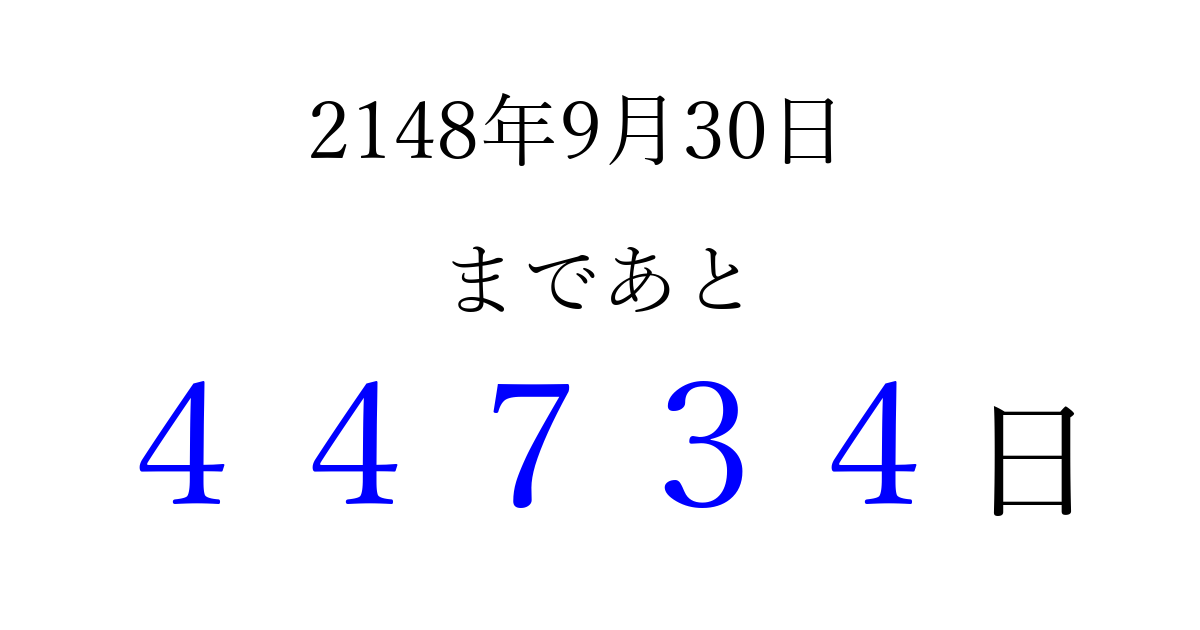 2148年9月30日(月)まで あと 99999 日です 追加すると、トップページからすぐ選べるようになります ※2026/04/09現在の結果です。 最新の状態に更新する ↓シェアして、タイムライン上にカウントダウンを表示しよう!↓ 📤 この結果を共有する Tweet シェア Threads Bluesky 別の日付でカウントダウン 2148年9月のカレンダー このページをブックマークに追加すると、いつでもカウントダウンを確認できます。 (PC: Ctrl+D / Mac: ⌘+D) hitome-notes.comでは以下のページも運営しています。 指定日と期間から日付を計算 | ガチャ確率計算・シミュレーション | プライバシー・ポリシー 運営者:Avocado