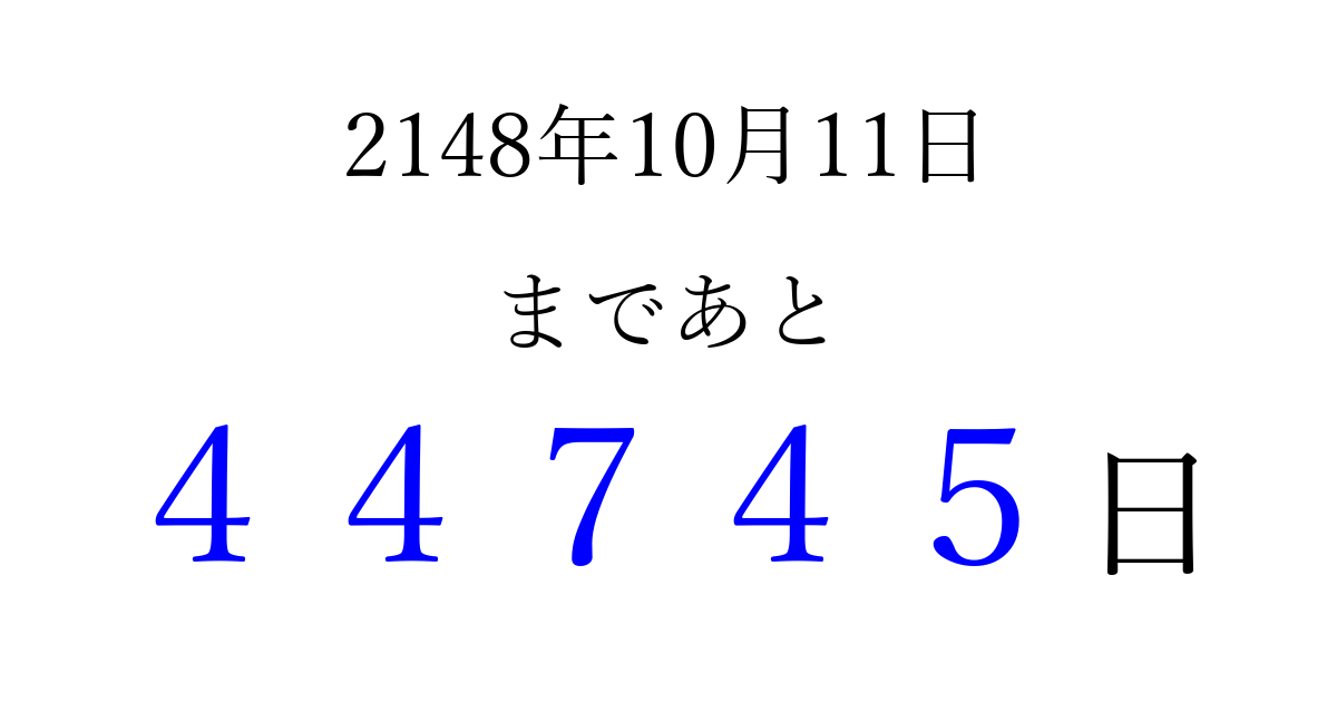 2148年10月11日(金)まで あと 99999 日です 追加すると、トップページからすぐ選べるようになります ※2026/04/09現在の結果です。 最新の状態に更新する ↓シェアして、タイムライン上にカウントダウンを表示しよう!↓ 📤 この結果を共有する Tweet シェア Threads Bluesky 別の日付でカウントダウン 2148年10月のカレンダー このページをブックマークに追加すると、いつでもカウントダウンを確認できます。 (PC: Ctrl+D / Mac: ⌘+D) hitome-notes.comでは以下のページも運営しています。 指定日と期間から日付を計算 | ガチャ確率計算・シミュレーション | プライバシー・ポリシー 運営者:Avocado