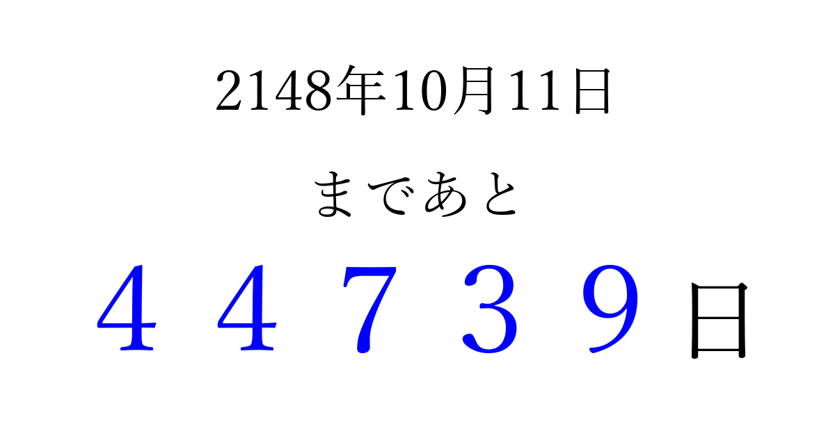 2148年10月11日(金)まで あと 99999 日です 追加すると、トップページからすぐ選べるようになります ※2026/04/15現在の結果です。 最新の状態に更新する ↓シェアして、タイムライン上にカウントダウンを表示しよう!↓ 📤 この結果を共有する Tweet シェア Threads Bluesky 別の日付でカウントダウン 2148年10月のカレンダー このページをブックマークに追加すると、いつでもカウントダウンを確認できます。 (PC: Ctrl+D / Mac: ⌘+D) hitome-notes.comでは以下のページも運営しています。 指定日と期間から日付を計算 | ガチャ確率計算・シミュレーション | プライバシー・ポリシー 運営者:Avocado