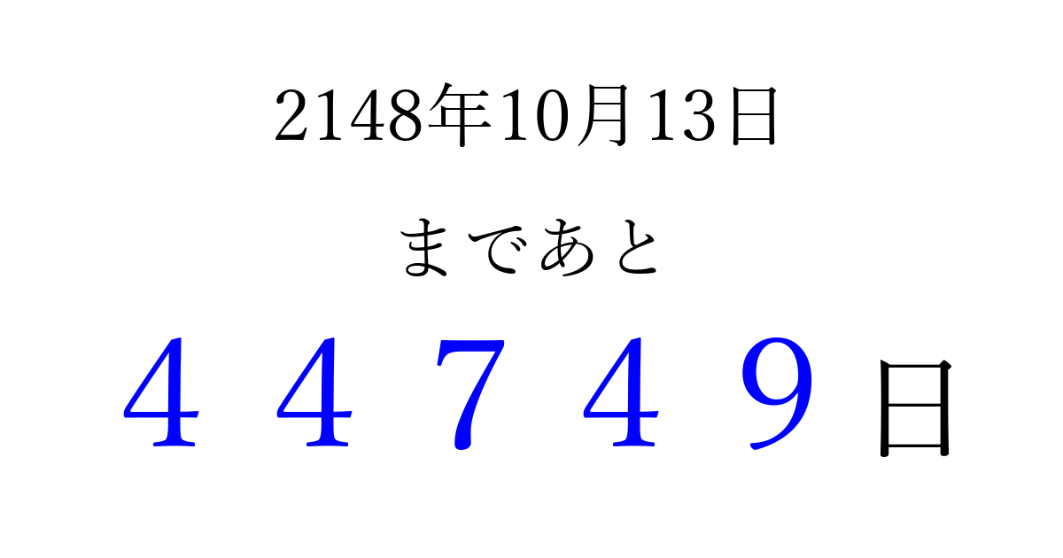 2148年10月13日(日)まで あと 99999 日です 追加すると、トップページからすぐ選べるようになります ※2026/04/07現在の結果です。 最新の状態に更新する ↓シェアして、タイムライン上にカウントダウンを表示しよう!↓ 📤 この結果を共有する Tweet シェア Threads Bluesky 別の日付でカウントダウン 2148年10月のカレンダー このページをブックマークに追加すると、いつでもカウントダウンを確認できます。 (PC: Ctrl+D / Mac: ⌘+D) hitome-notes.comでは以下のページも運営しています。 指定日と期間から日付を計算 | ガチャ確率計算・シミュレーション | プライバシー・ポリシー 運営者:Avocado