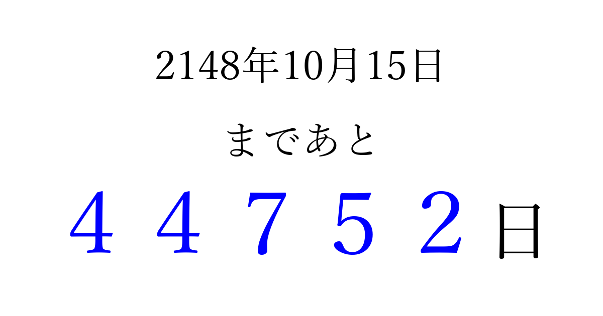 2148年10月15日(火)まで あと 99999 日です 追加すると、トップページからすぐ選べるようになります ※2026/04/06現在の結果です。 最新の状態に更新する ↓シェアして、タイムライン上にカウントダウンを表示しよう!↓ 📤 この結果を共有する Tweet シェア Threads Bluesky 別の日付でカウントダウン 2148年10月のカレンダー このページをブックマークに追加すると、いつでもカウントダウンを確認できます。 (PC: Ctrl+D / Mac: ⌘+D) hitome-notes.comでは以下のページも運営しています。 指定日と期間から日付を計算 | ガチャ確率計算・シミュレーション | プライバシー・ポリシー 運営者:Avocado