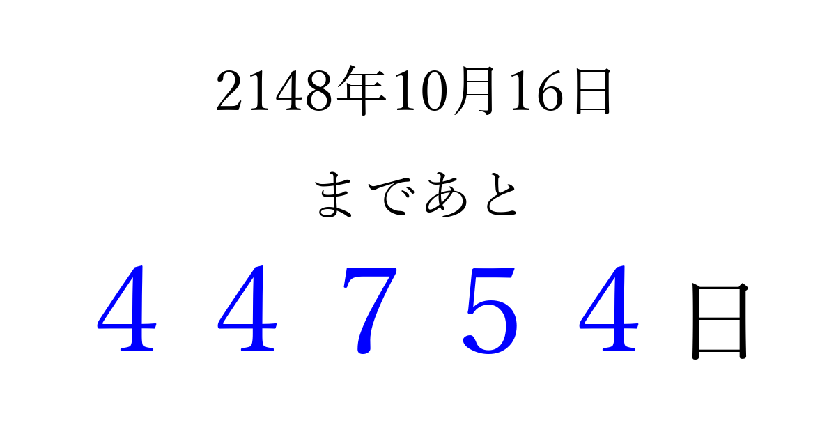2148年10月16日(水)まで あと 99999 日です 追加すると、トップページからすぐ選べるようになります ※2026/04/05現在の結果です。 最新の状態に更新する ↓シェアして、タイムライン上にカウントダウンを表示しよう!↓ 📤 この結果を共有する Tweet シェア Threads Bluesky 別の日付でカウントダウン 2148年10月のカレンダー このページをブックマークに追加すると、いつでもカウントダウンを確認できます。 (PC: Ctrl+D / Mac: ⌘+D) hitome-notes.comでは以下のページも運営しています。 指定日と期間から日付を計算 | ガチャ確率計算・シミュレーション | プライバシー・ポリシー 運営者:Avocado