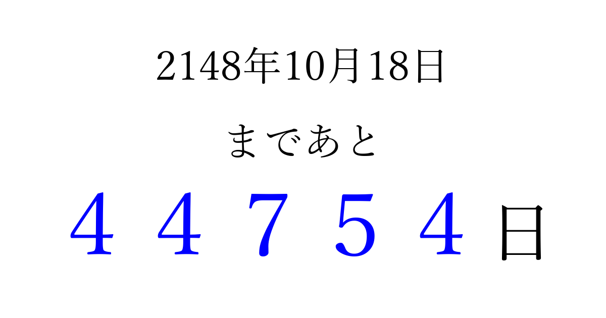 2148年10月18日(金)まで あと 99999 日です 追加すると、トップページからすぐ選べるようになります ※2026/04/07現在の結果です。 最新の状態に更新する ↓シェアして、タイムライン上にカウントダウンを表示しよう!↓ 📤 この結果を共有する Tweet シェア Threads Bluesky 別の日付でカウントダウン 2148年10月のカレンダー このページをブックマークに追加すると、いつでもカウントダウンを確認できます。 (PC: Ctrl+D / Mac: ⌘+D) hitome-notes.comでは以下のページも運営しています。 指定日と期間から日付を計算 | ガチャ確率計算・シミュレーション | プライバシー・ポリシー 運営者:Avocado