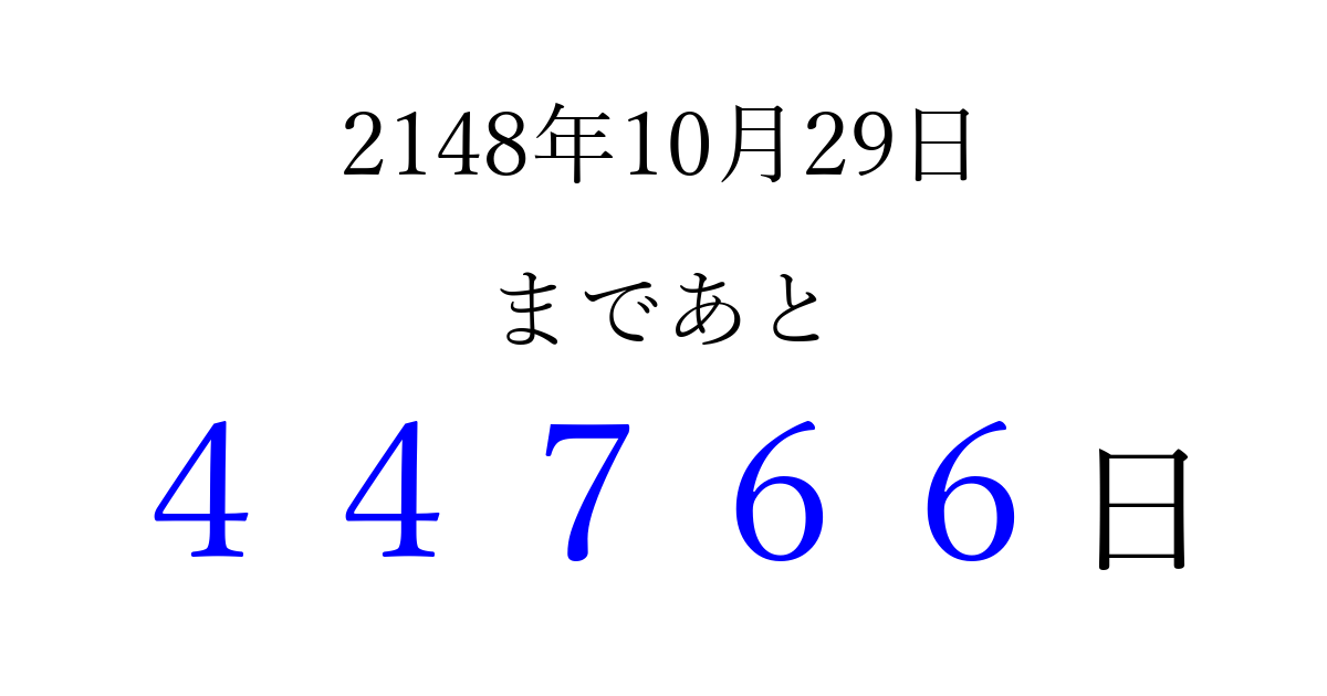 2148年10月29日(火)まで あと 99999 日です 追加すると、トップページからすぐ選べるようになります ※2026/04/06現在の結果です。 最新の状態に更新する ↓シェアして、タイムライン上にカウントダウンを表示しよう!↓ 📤 この結果を共有する Tweet シェア Threads Bluesky 別の日付でカウントダウン 2148年10月のカレンダー このページをブックマークに追加すると、いつでもカウントダウンを確認できます。 (PC: Ctrl+D / Mac: ⌘+D) hitome-notes.comでは以下のページも運営しています。 指定日と期間から日付を計算 | ガチャ確率計算・シミュレーション | プライバシー・ポリシー 運営者:Avocado